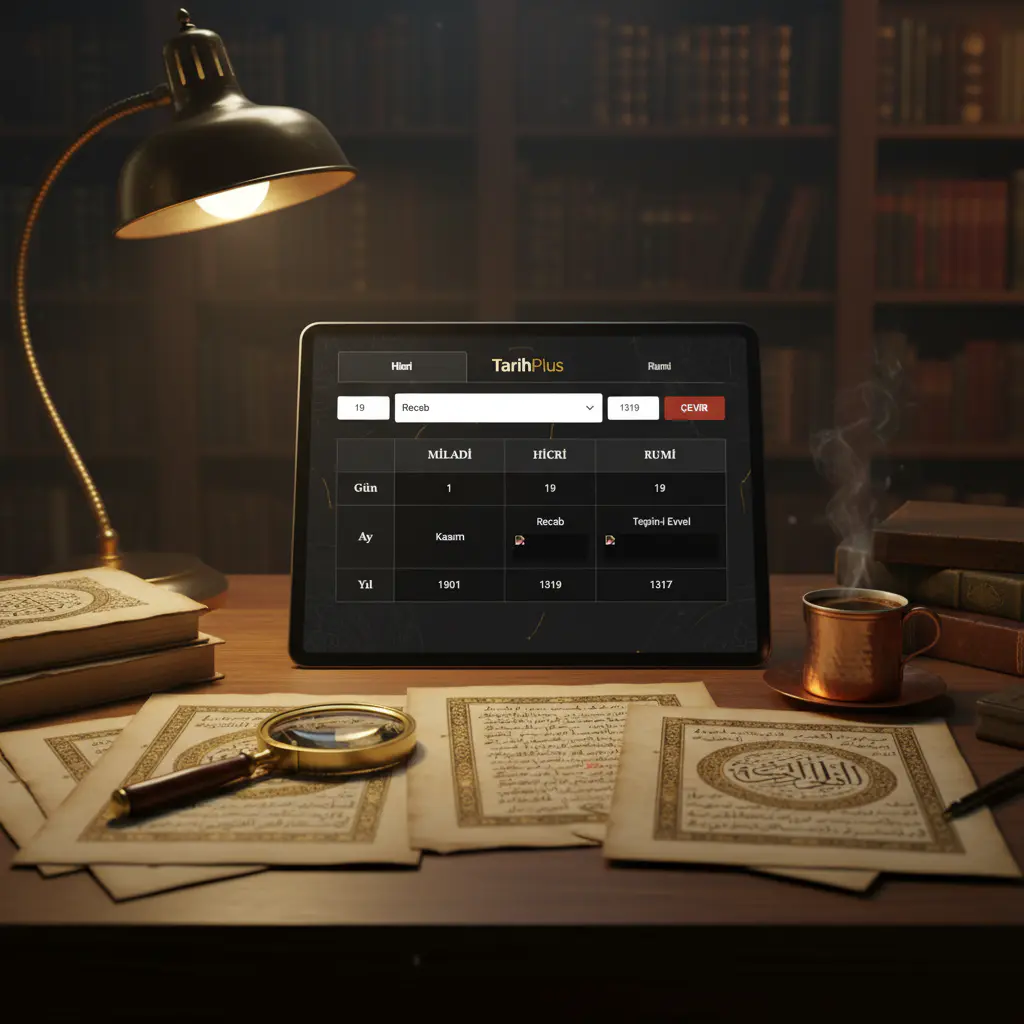 Arşiv kayıtlarına dayalı, yüksek doğrulukla Hicri-Rumi-Miladi tarih dönüşümü. Orijinal el yazısı örnekleriyle belge okumayı kolaylaştıran tek araç.